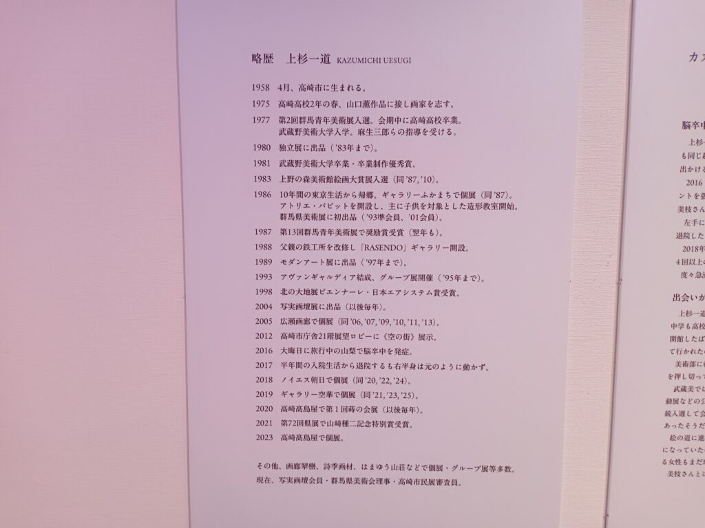 今回の展示では、上杉さんが学生の頃に模写した作品から、脳卒中に倒れる前後の作風の違いまでが展示されており、まさしく上杉さんの画家人生そのものを拝見しているような、そんな尊い空間となっております。