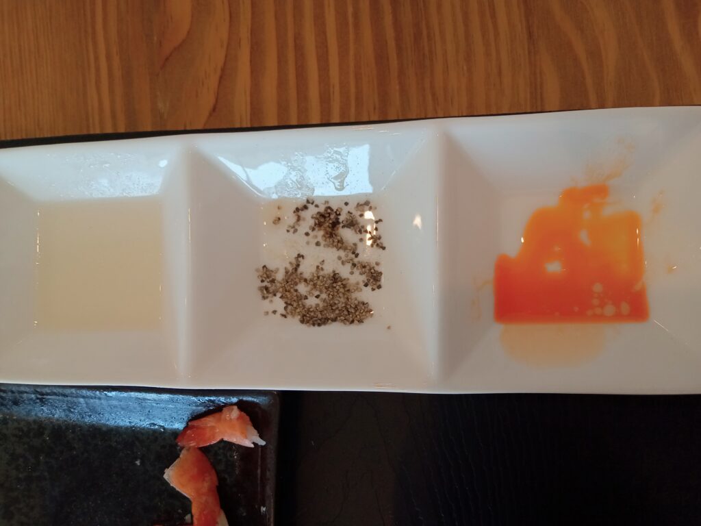 食べ方的には、まず何もつけずに食べる。次に小皿にある酢・ブラックペッパー・ラー油などで味変を楽しむ。といった感じです。いや、素が美味しすぎてタレの存在を忘れていました。