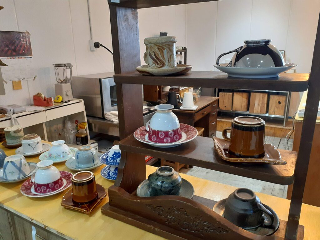 テーブル・椅子、コーヒーカップ&ソーサーも古道具品で、販売可能。実際に手に取って気に入ったらお迎えできるのは嬉しいですね。