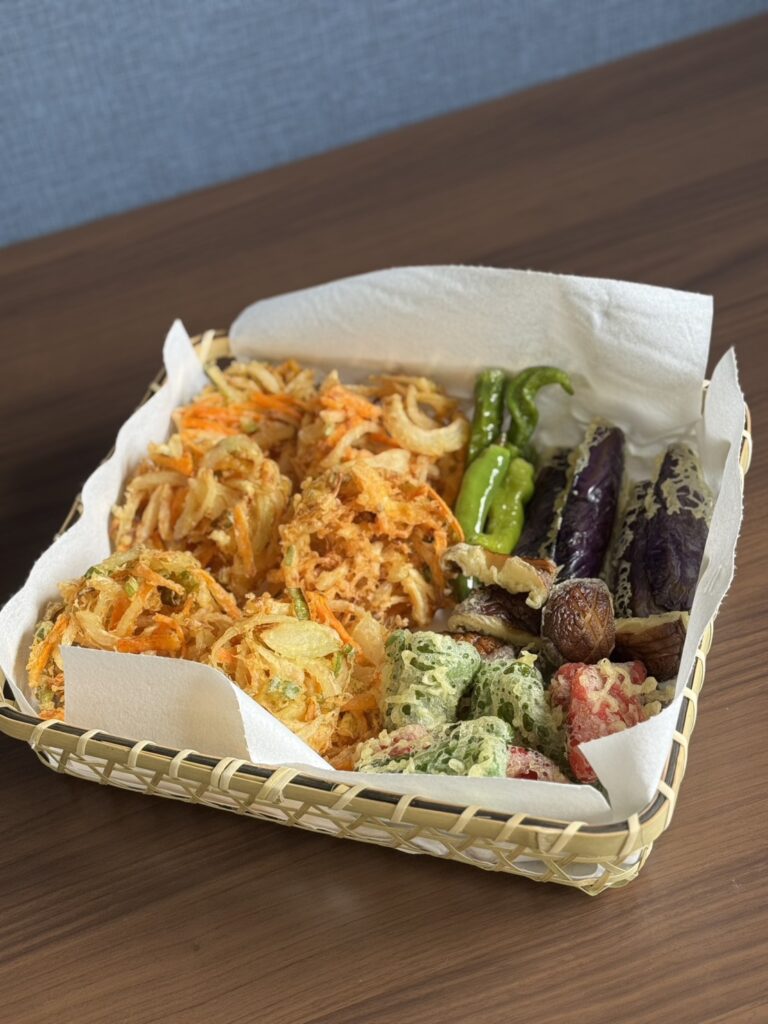 天ぷらの野菜はどれも地元野菜を使ったもの。旬の素材が活きている、揚げたてサクサク天ぷらです。