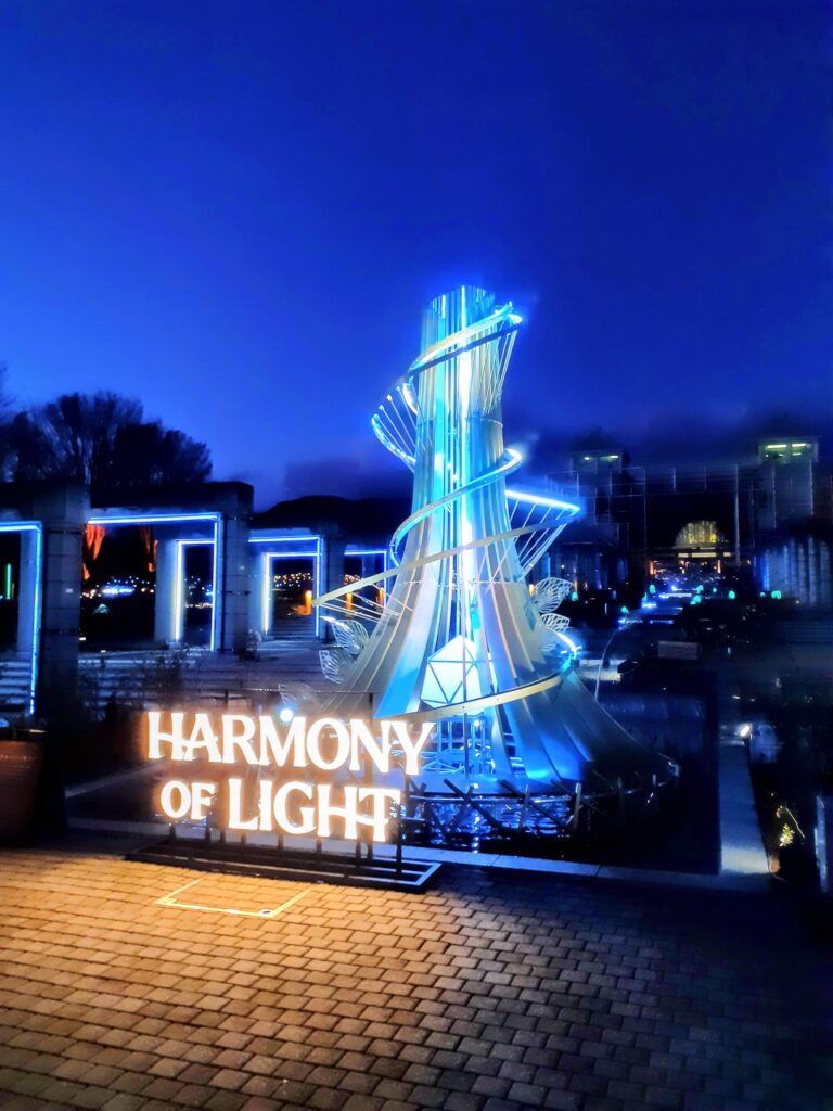 さあライトアップスタート!!メインストリートのシンボルタワーが光と音のハーモニーを奏で始めました!