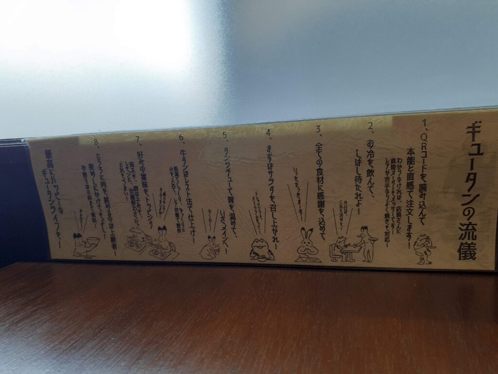 注文後は、お店独自の「ギュータンの流儀」をよく読んで待ちましょう。