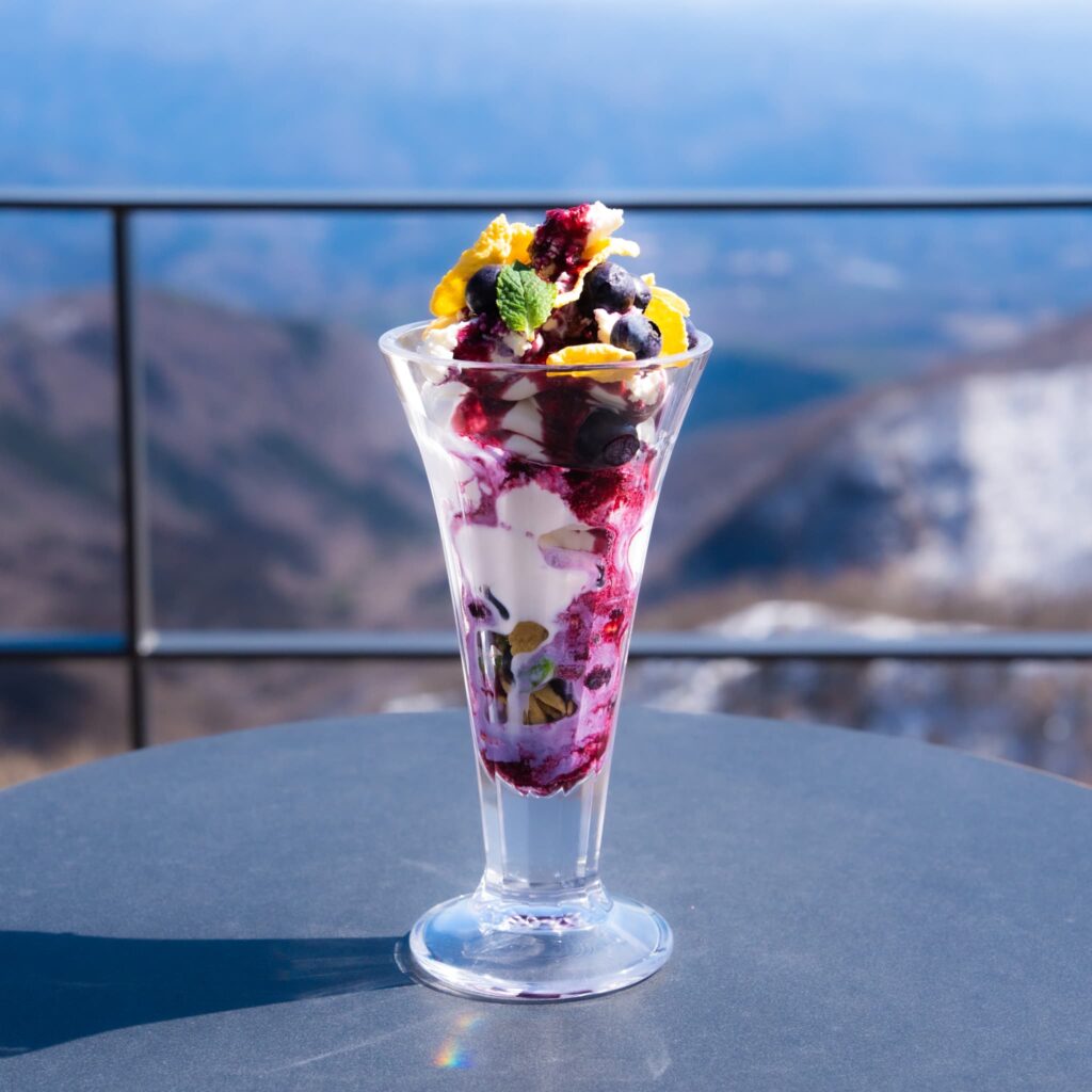 さらに、人気メニュー「あかぎのソフトクリーム」をつかった「あかぎのブルーベリーチーズパフェ」も新登場。ソフトクリームのミルクをつくっているThreeBrownのチーズ、ブルーベリーマフィンをつくっているはなぶさ有機農園のブルーベリーなど、いずれも地元の食材をつかった、パフェです。
