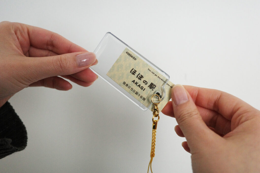 ここでしか買えない「ほぼの駅 AKAGI」オリジナルのくつ下、アクリルスタンド、切符モチーフのグッズも。