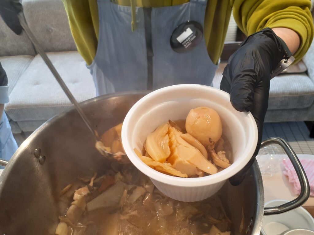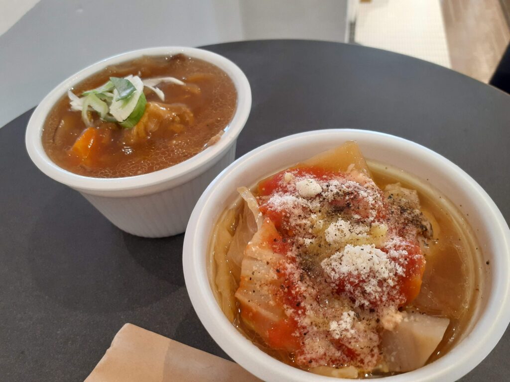 ▲グランドオープンに合わせ、アルファオープン時から人気の豚汁「ジャパン」(和風)とともに「イタリア的」(トマトベース・右)も引き続き提供。新たにカレー味(左)が追加。※豚汁の写真は、内覧会時の試食用のもの